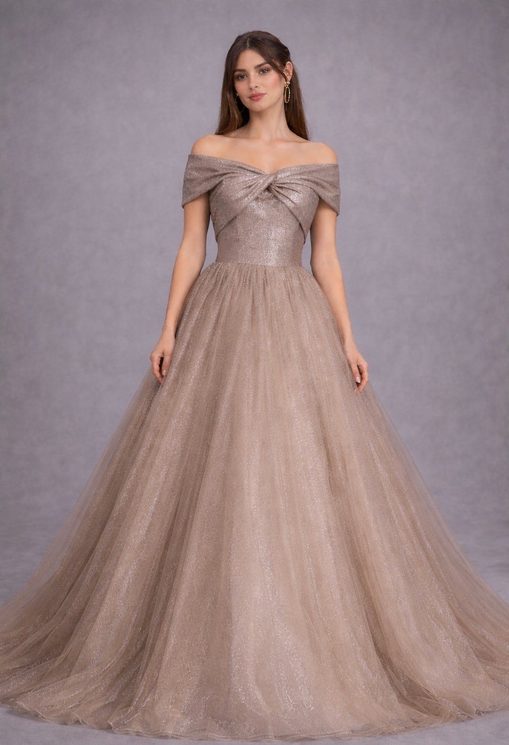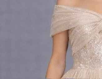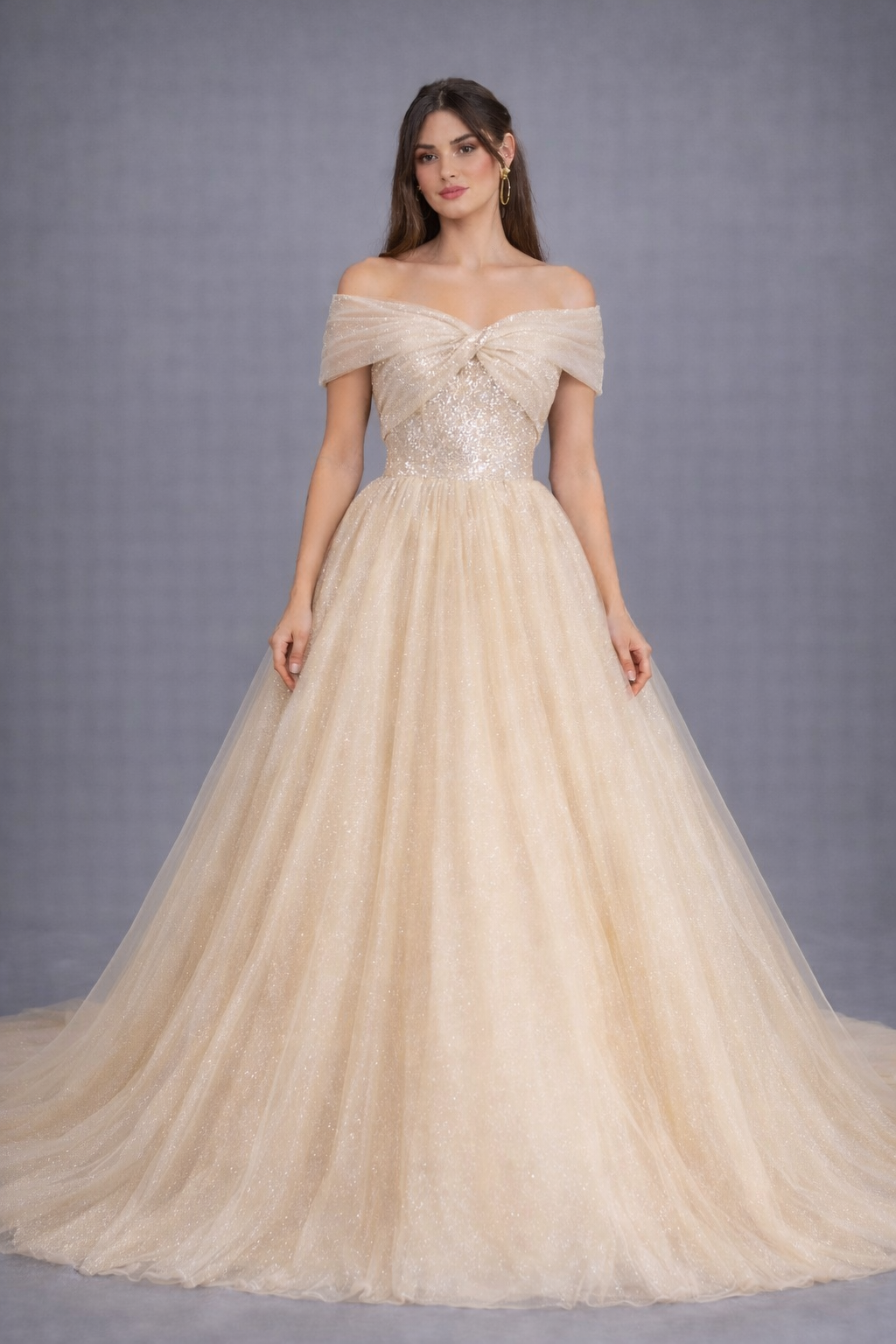 فستان خطوبة كريمي بقصة صدر اوف شولدر من القماش الامع ليمنح إحساسًا فاخرا
