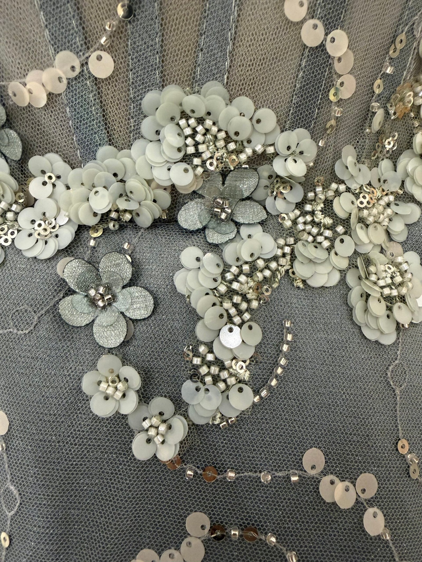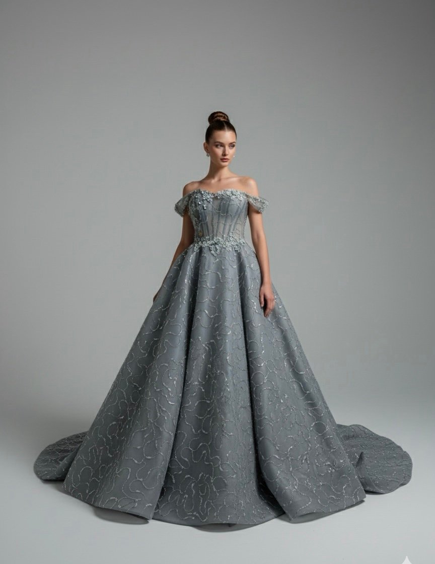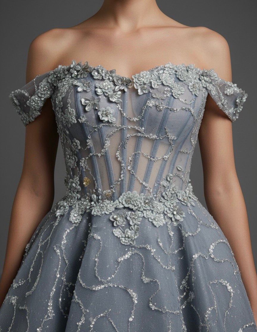 فستان شبكة راقي بذيل لونه ازرق مخضر بصدر كورسيه بقماش التول وزهور على منطقة الصدر والوسط وبقية الفستان عروق رفيعه مطرزة باللون الفضي