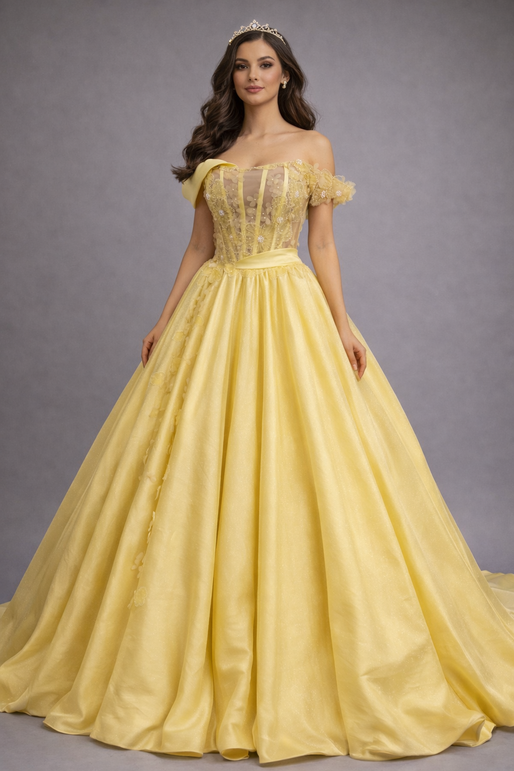 فستان خطوبة أو سهرة كورسيه وأوف شولدر مع أكمام مصممة بذوق أنثوي راقٍ