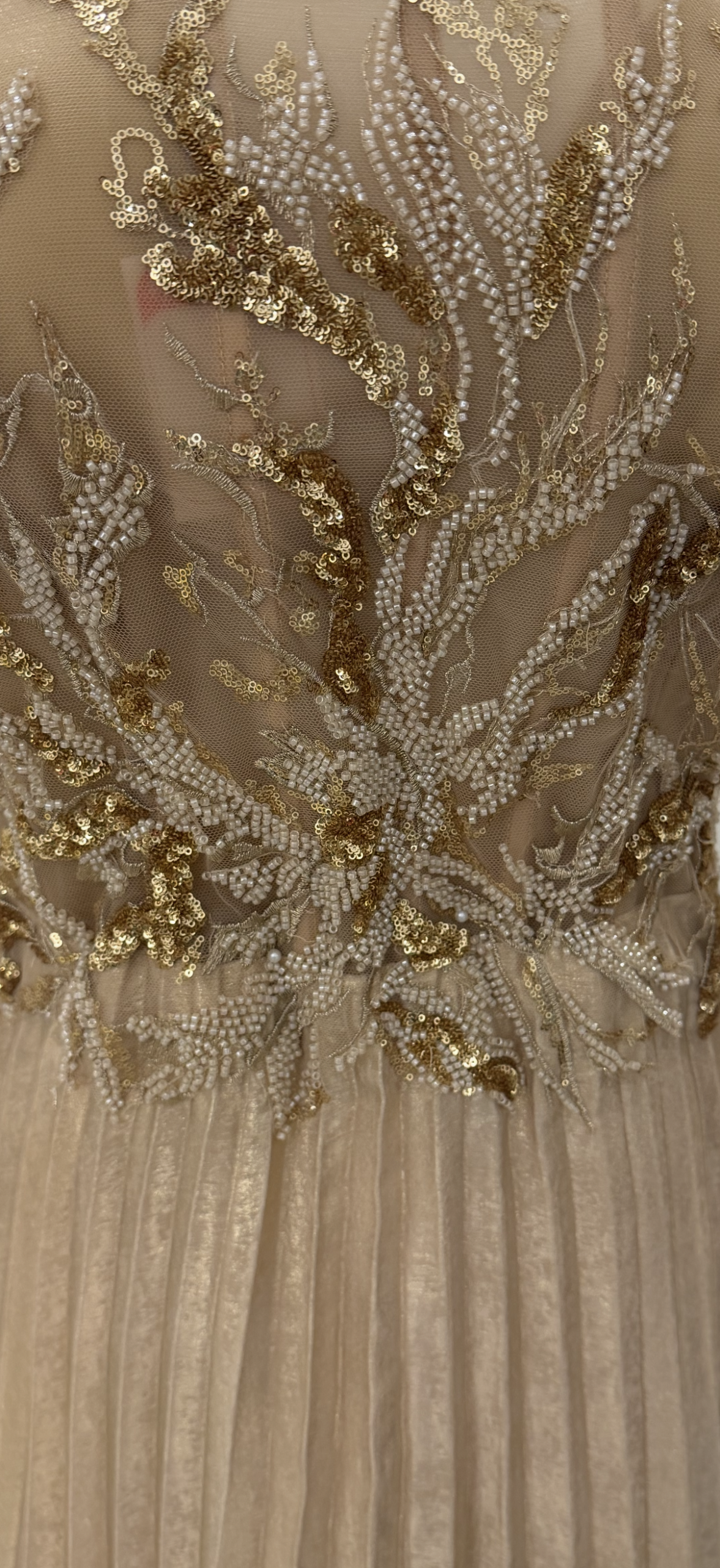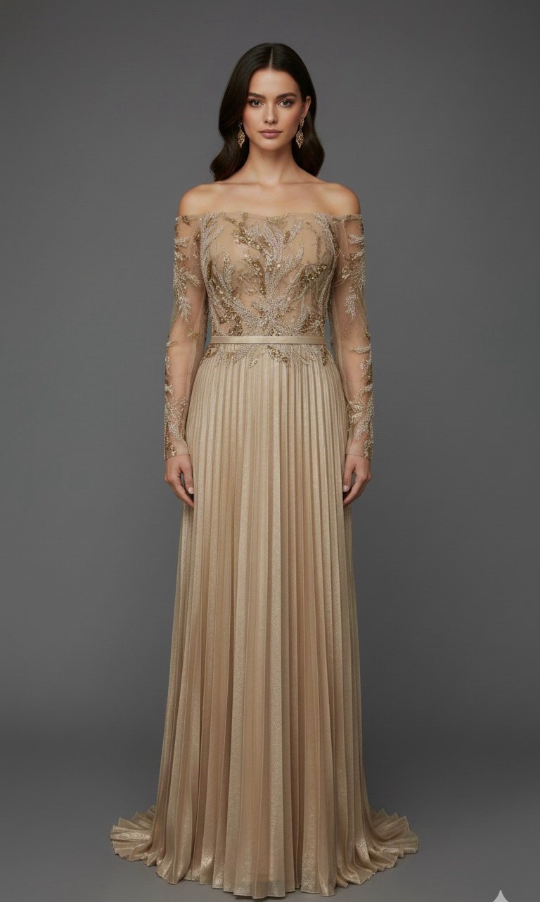 مقاس L , مقاس Xl ,فستان سهرة فخم لون ذهبي الصدر مطرز والجزء السفلي مكسر