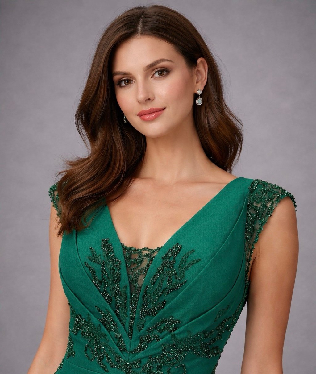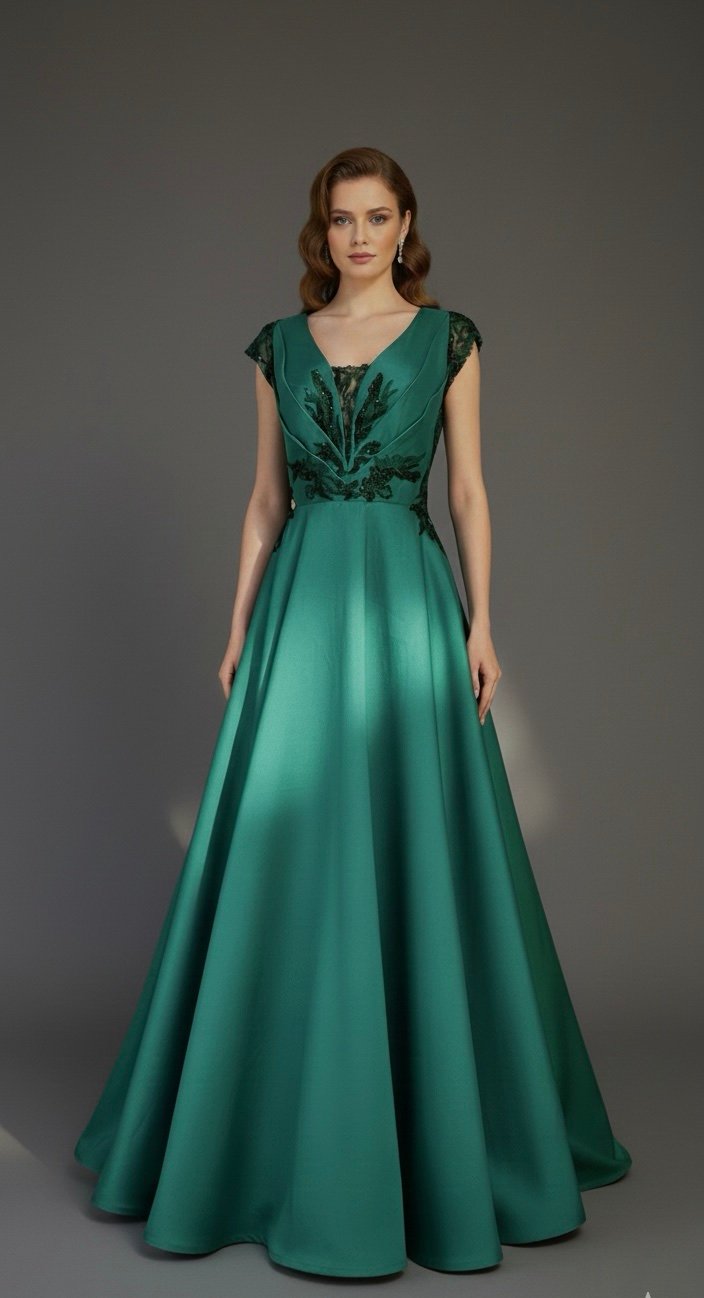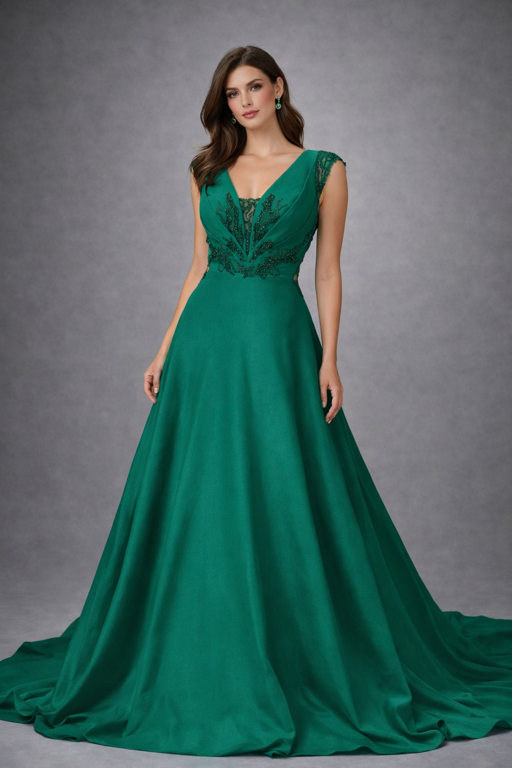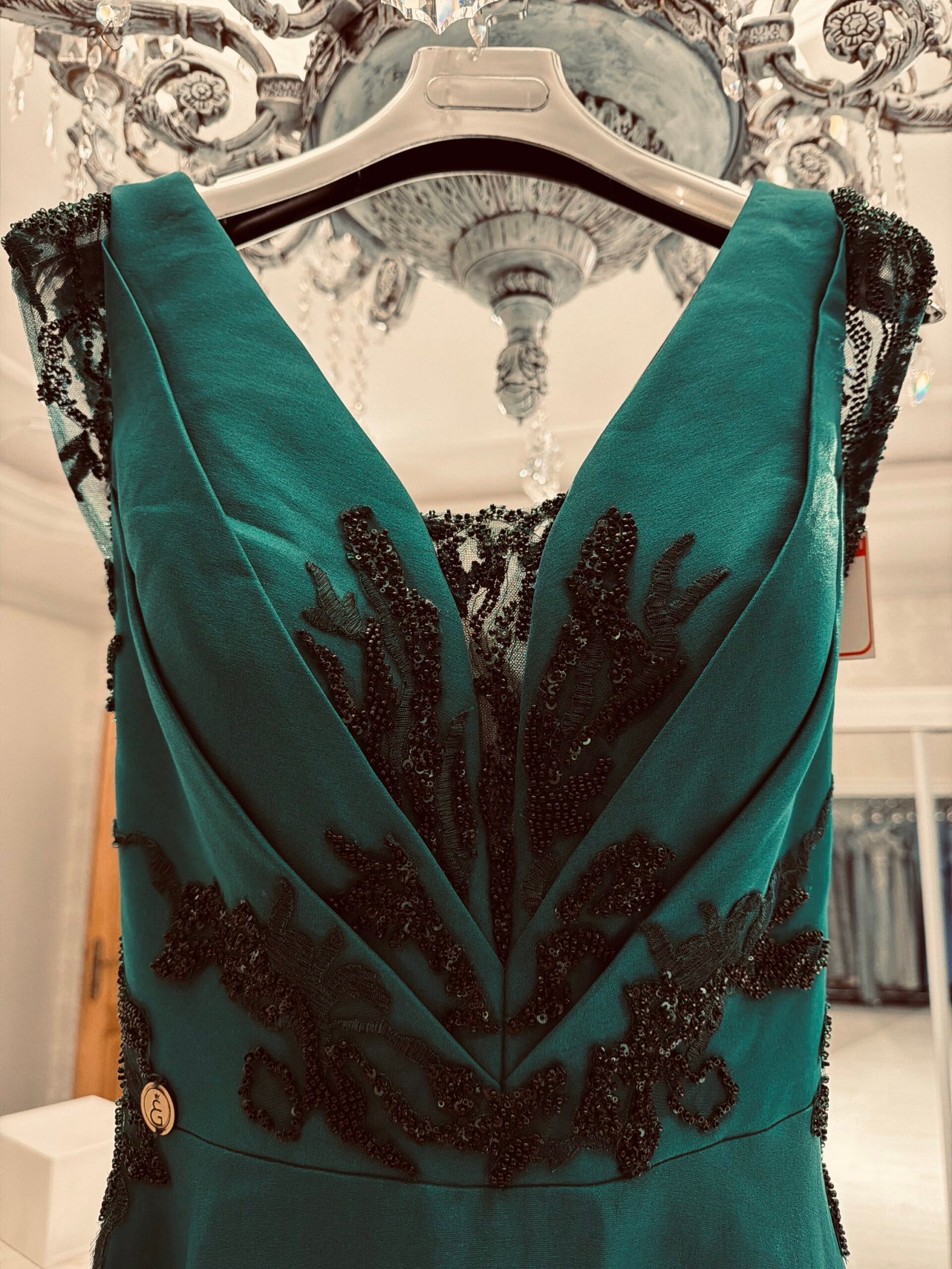 فستان اخضر راقي بتطريز خرز ناعم يعطي وسط جميل وطول