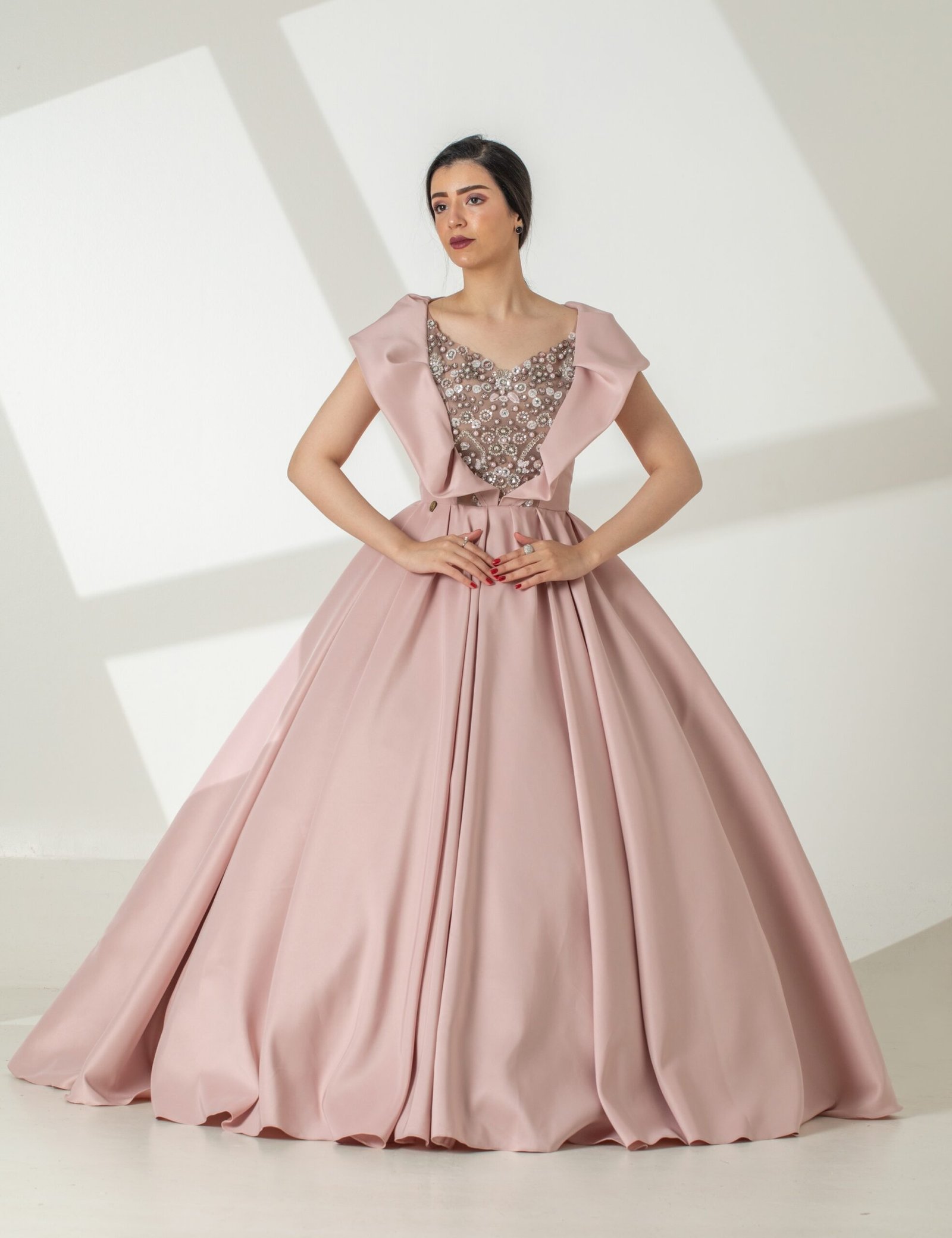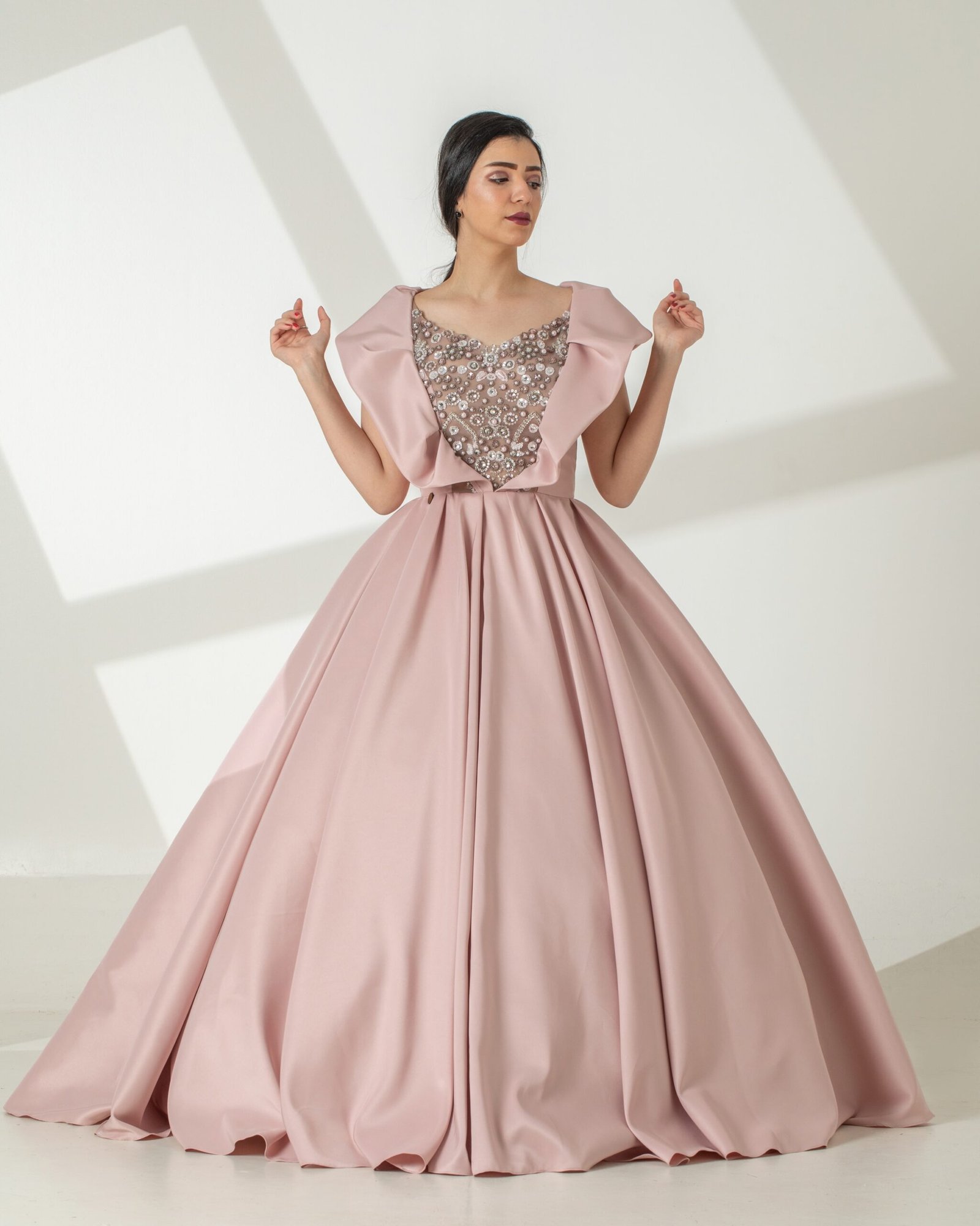 فستان خطوبة أو سهرة بكرنيش راقي على الصدر مصمم بذوق أنثوي راقٍ