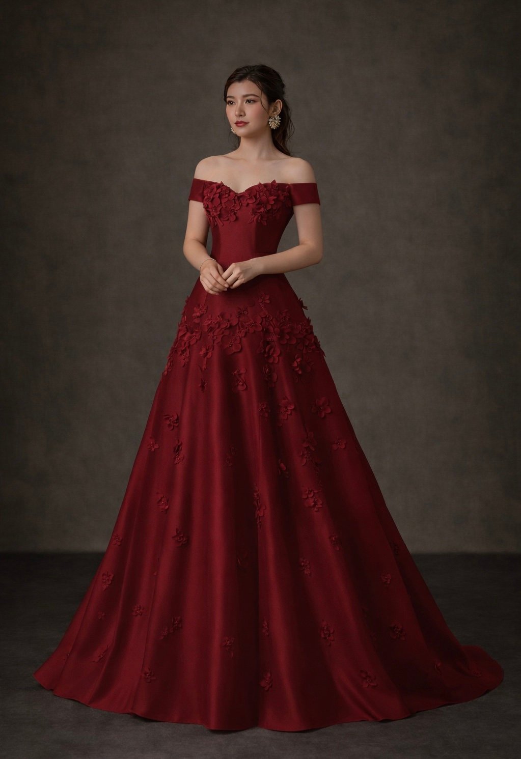 فستان سهرة او خطوبة بقصة أوف شولدر أنيقة وقصة كلوش متوازنة