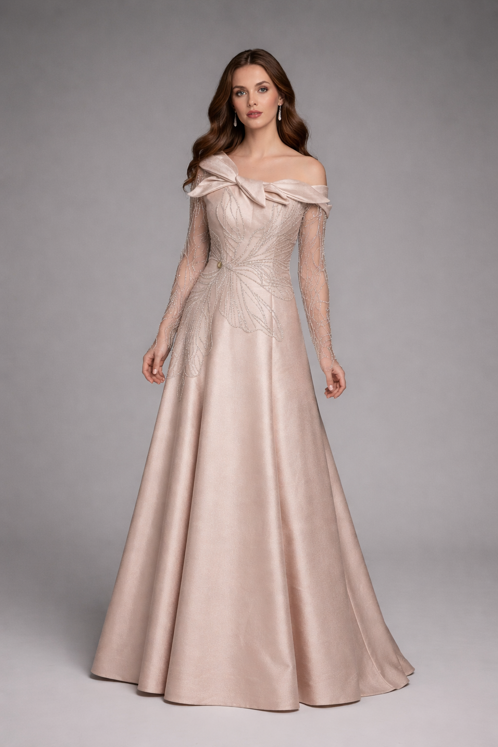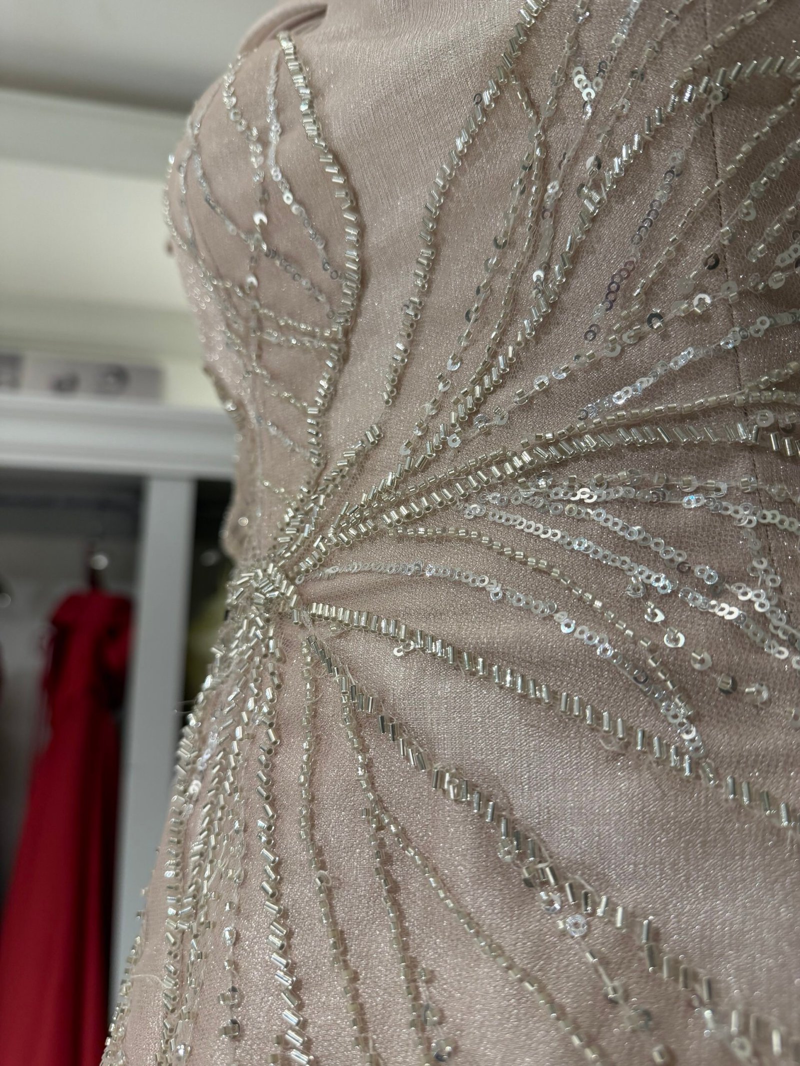 فستان سهرة لون بيبي بنك مطرز من قماش التفته