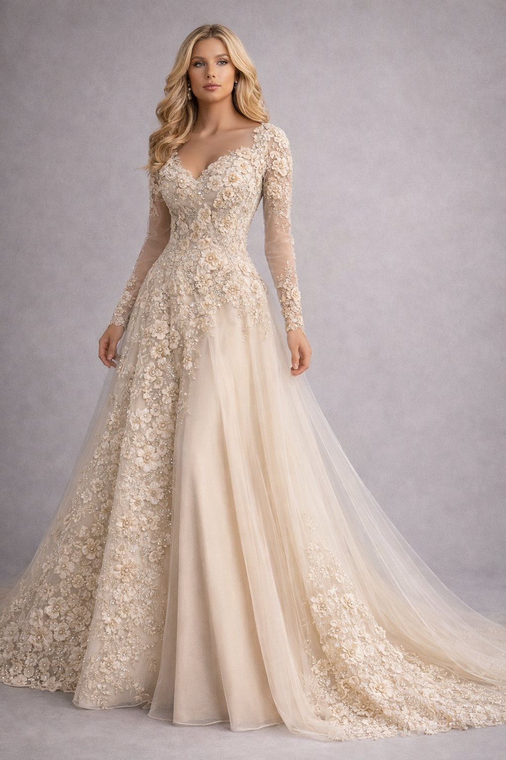 فستان سهرة لون بيج مطرز ومنثور بورد بارز باكمام من التول طويلة
