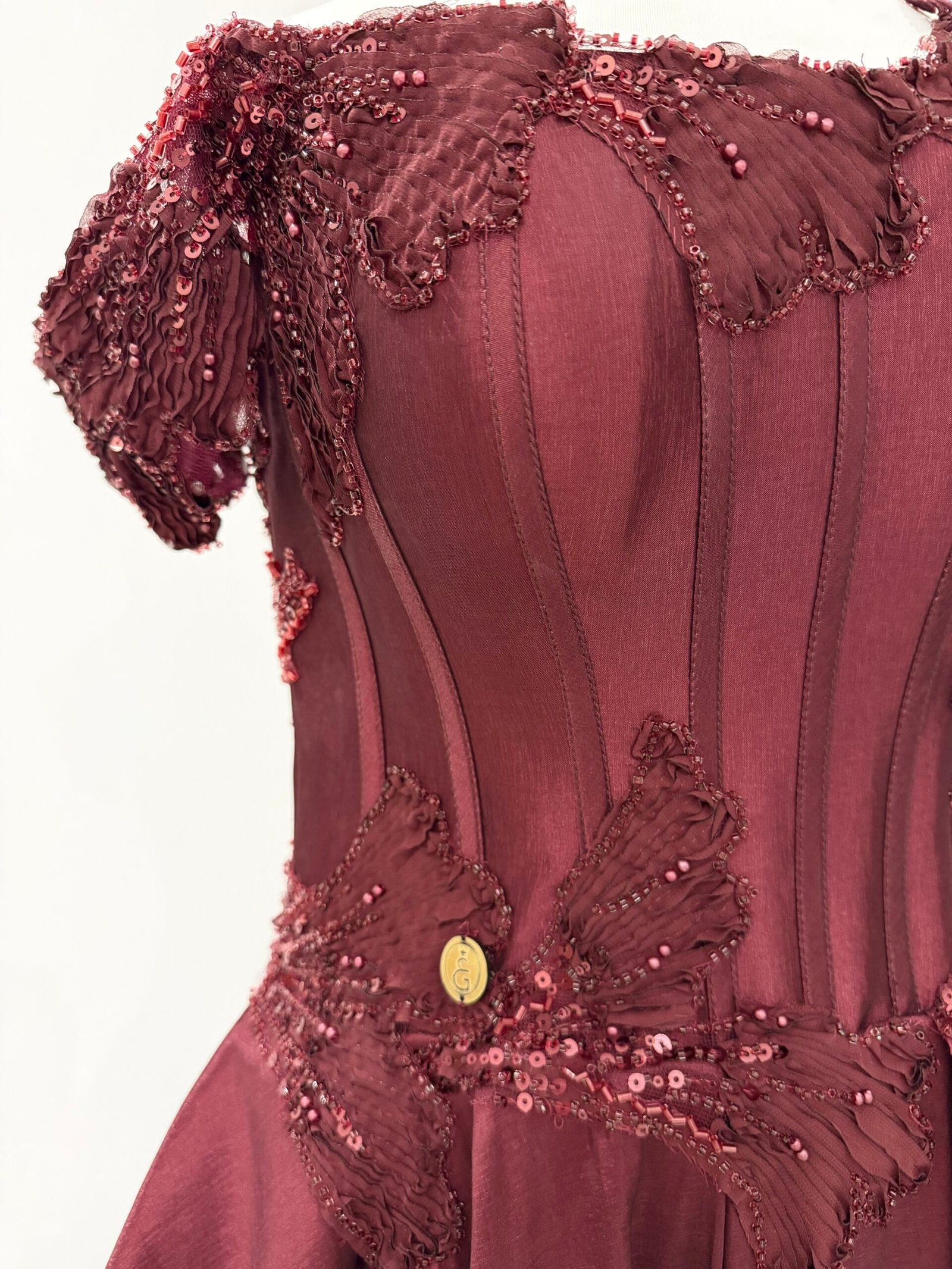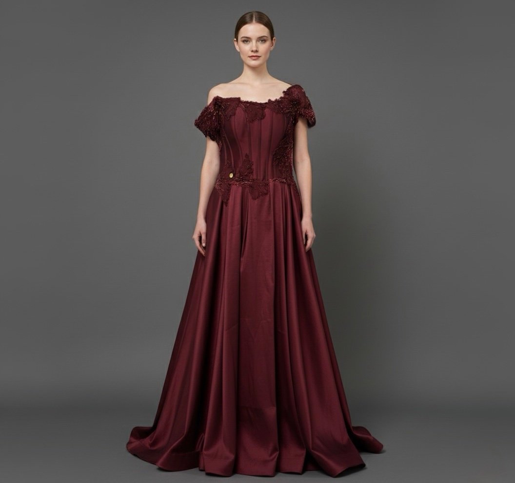 فستان عودي مطرز كم اوف شولدر وكم آخر متدلي كسر على الوسط